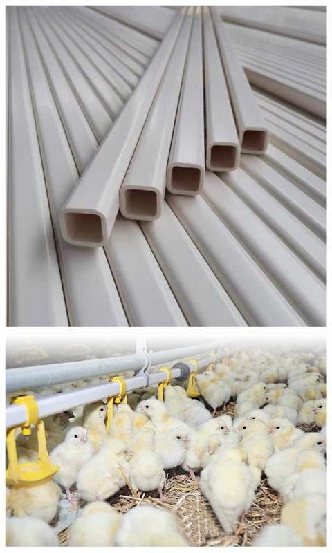 Là đường cung cấp nước cốt lõi cho người uống núm vú, các ống hình vuông PVC cho các dòng nước nuôi trồng thủy sản được đặt theo chiều ngang hoặc chiều dọc dọc theo lồng của nhà gà (lồng xếp chồng, lồng thang). Các đường ống có khẩu độ đặt trước để phù hợp với người uống núm vú (10-15 cm trên 10-15 cm). Thích hợp cho gà mổ và uống. Các ống vuông PVC cho các dòng nước nuôi trồng thủy sản chống lại sự tích tụ nước, giảm sự phát triển của tảo và ô nhiễm vi khuẩn. Các vật liệu không độc hại (sử dụng PVC cấp thủy sản) ngăn ngừa ngộ độc nước ở gà. Các ống vuông cũng cứng và có thể được cố định trực tiếp vào khung lồng, ngăn chặn chuyển động do chuyển động của đàn.